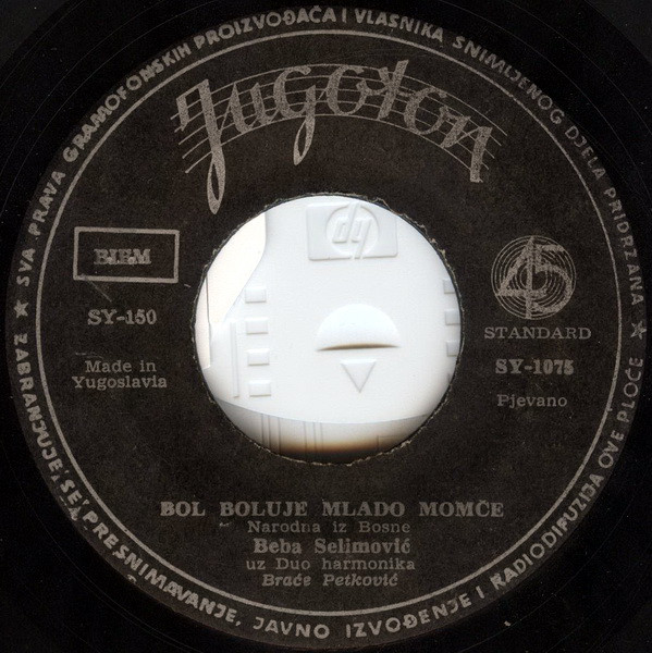 La llevó a cabo una de las damas de la sevdalinka, Beba Selimović, en 1958, en compañía de los hermanos Petković, Jovica y Ratomir, que se marcan un dignísimo dúo de acordeones. Aquel vinilo se abría, en su cara A, con el Po mojoj bašti zumbuli cvjetaju de Jozo Penava, otro de los pilares compositivos e interpretativos del Sevdah. Se trata de la primera grabación oficial editada de Beba (18 añitos contaba; cuatro más que cuando fue fichada por Radio Sarajevo), y una buena muestra de la que se le venía encima a los amantes del género en las décadas siguientes. No encontrarán muchas más referencias oficiales editadas de otros artistas, en torno a nuestro tema. Eso sí, hay que aclarar que fueron muchos (y muy grandes) los que se enfrentaron a él, tanto en sesiones de la propia Radio Sarajevo, como en directo: Nada Mamula, Zaim Imamović, Silvana Armenulić, Radmila Jagodić, Mila Lekić… y, más recientemente, el propio Damir Imamović, junto a Jusuf Brkić.