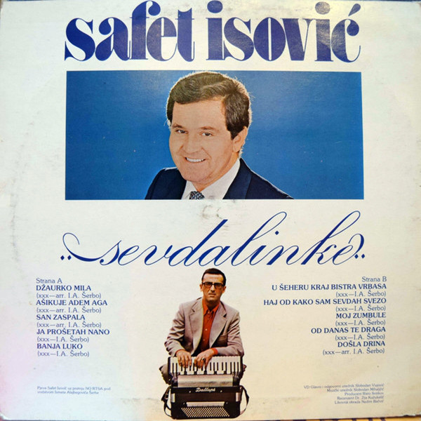 Eso sí, no fue la primera. Posiblemente, el honor recaiga en la grabada por Stanoje Todorović, ¡en 1908! (vía Gramophone Concert Record). Toda una delicia que aquí pueden escuchar. Cuando Isović se animó a afrontarla, en 1982, el de Bileća ya llevaba más de 25 años de carrera. Su fama era total, e incluso se había convertido en uno de los embajadores más populares del folklore sonoro de Yugoslavia en el extranjero. Aquel elepé llevaba por título (tonterías, las justas) Sevdalinke, y fue publicado por el sello Diskoton. Estaba plagado de temas tradicionales pasados, todos ellos, por el filtro de un Ismet Alajbegović Šerbo que se encargó de todo aquello relacionado con el aspecto musical; sobre todo, de los arreglos, de la dirección musical y de llevar por la senda adecuada a la orquesta de Radio Sarajevo. La producción, eso sí, fue cosa de Risto Svirkov, reputado referente que ya había trabajado con Safet y otros grandes como Zehra Deović, Beba Selimović, Zora Dubljević, Hanka Paldum, Hamid Ragipović Besko, Zaim Imamović o Himzo Polovina.